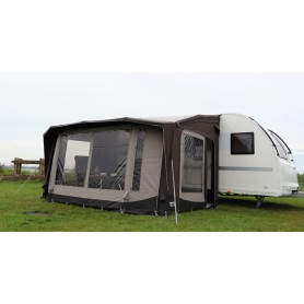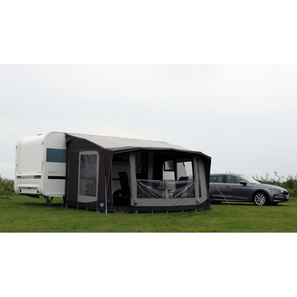 Telta Scenic är ett lyxigt förtält som kombinerar stil och komfort. Med sin fina design, stora panoramafönster och eleganta former ger det en ljus och rymlig känsla.