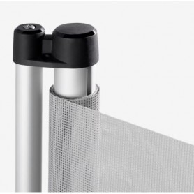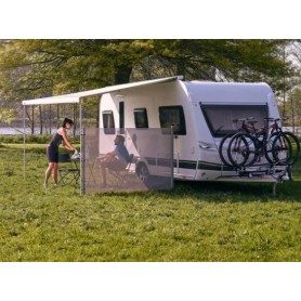 Vindskyddet är mikro-ventilerat för att släppa igenom hård vind. Snabb och enkel installation. Smidig förvaring med medföljande väska. Monteras på tältskenan eller med markisens hållare för stödbenen som man fäster på fordonets vägg. Höjd tyg, 140 cm. Längd, upp till 300 cm.